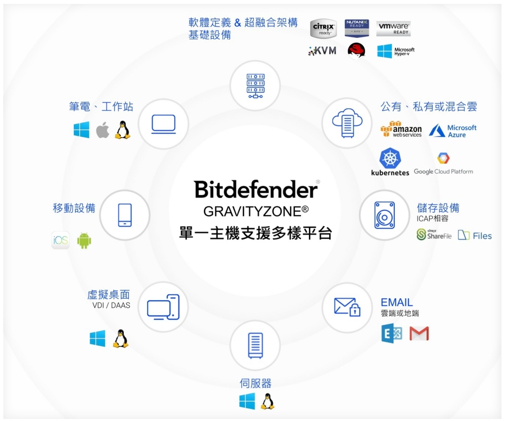 Bitdefender 提供集中式「單一的管理控制平台」與主動「多層次的防護」機制,其可於雲端託管或於本地佈署。通過提供跨平台安全性,為端點、伺服器、虛擬桌面、行動裝置和 Exchange 郵件服務,抵抗針對性的攻擊。此設計提供最大化的彈性及讓管理者方便設定資安政策。